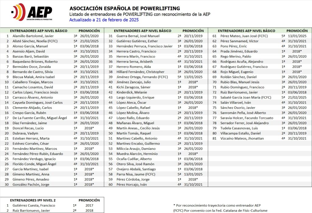 - La formación de entrenadores de powerlifting en las diferentes categorías y niveles.